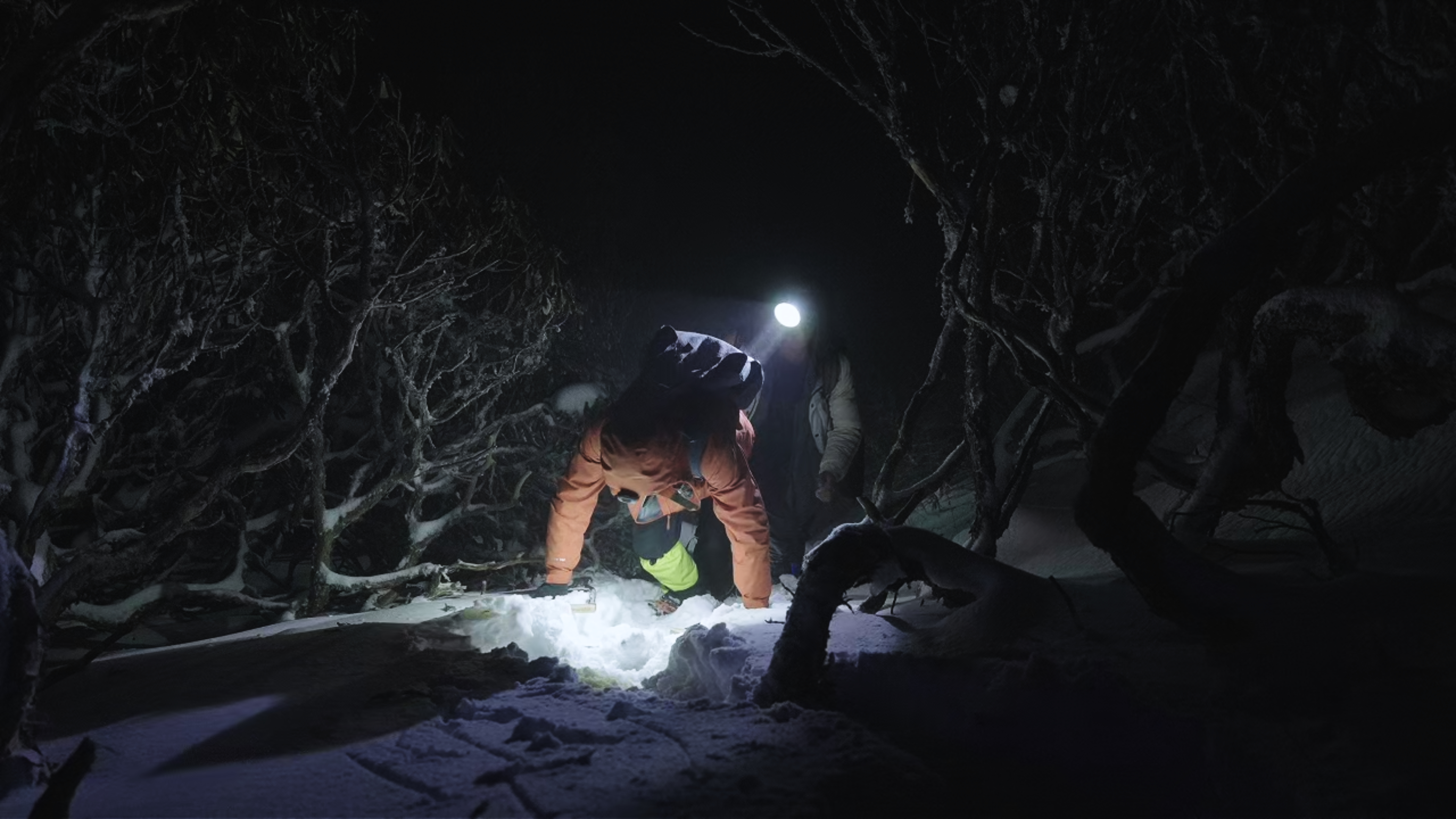 凌晨3点半出发,岳楠小心翼翼地走在队伍末尾,拐杖杵进雪里,拔出一个超过10厘米的洞。越过杜鹃林最后一个高坡,他的手套已经打湿,一路上他摔倒了不知多少次。