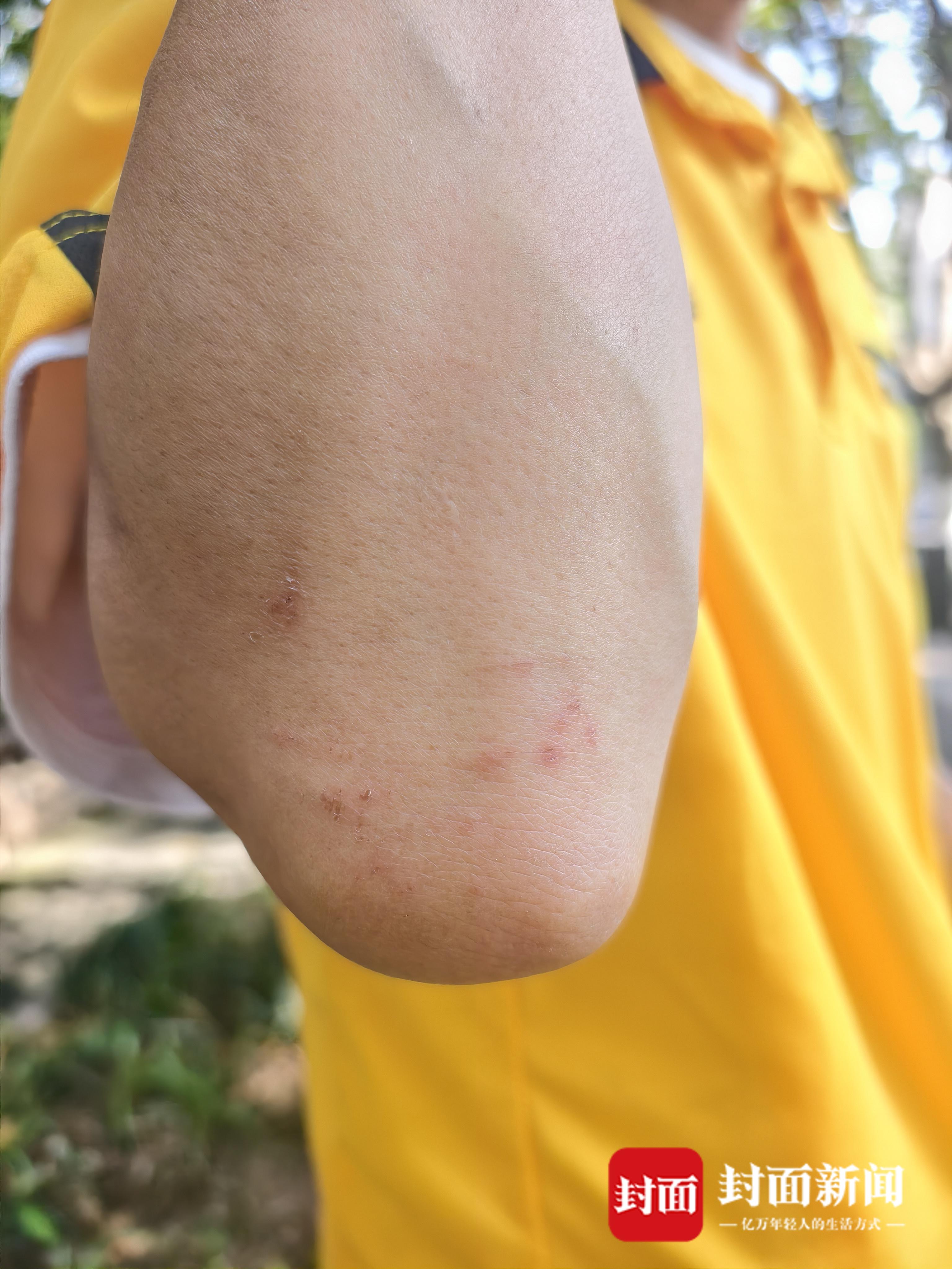 陈俊飞用手肘抵着井壁下井,手肘处被刮了小伤痕。封面新闻记者 徐庆 摄