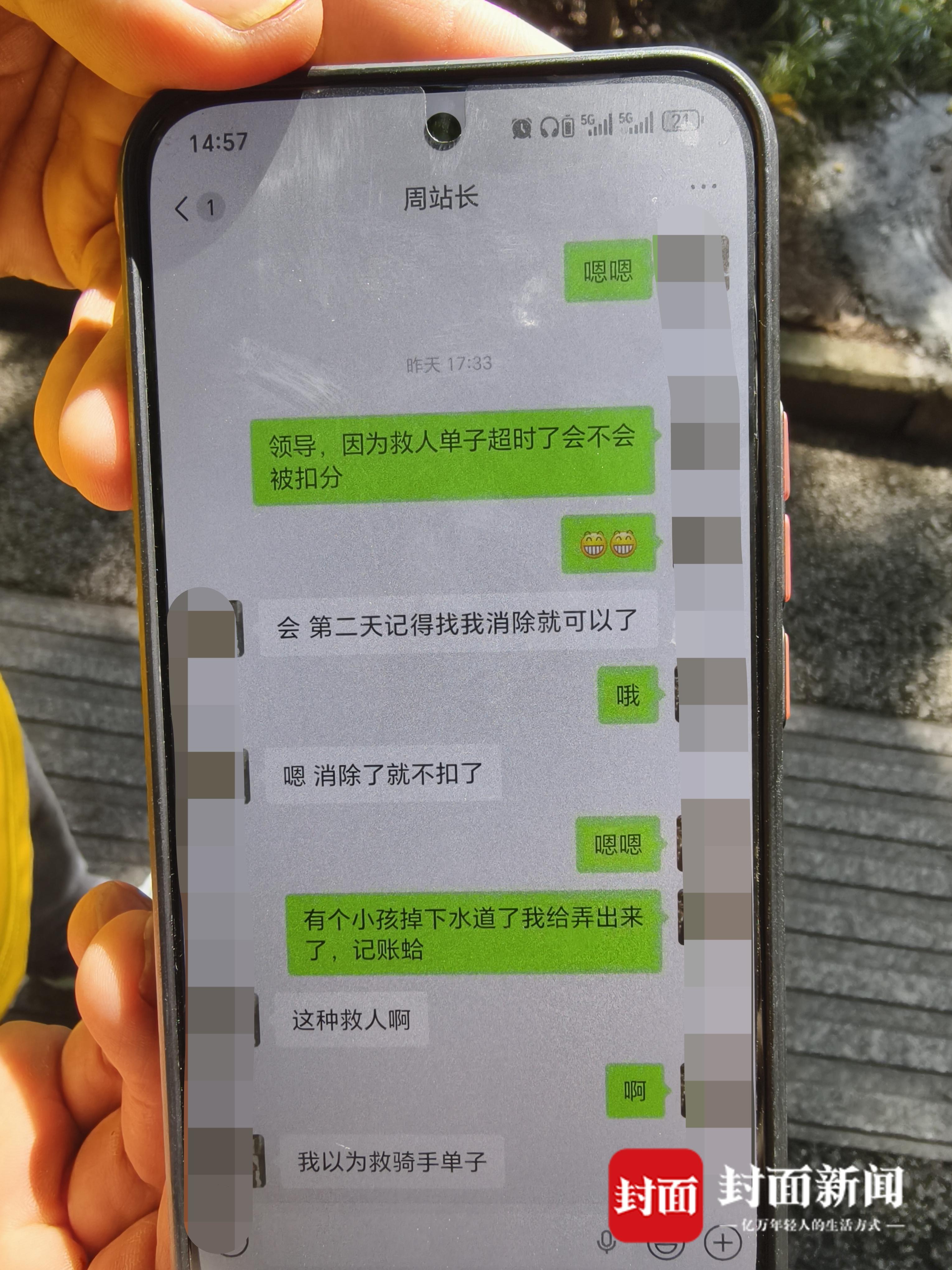 陈俊飞担心超时向站长报备说“救人”,站长会错意以为是骑手之间互相帮忙“救单”,而后,站长将陈俊飞救人事件上报给平台。封面新闻记者 徐庆 摄